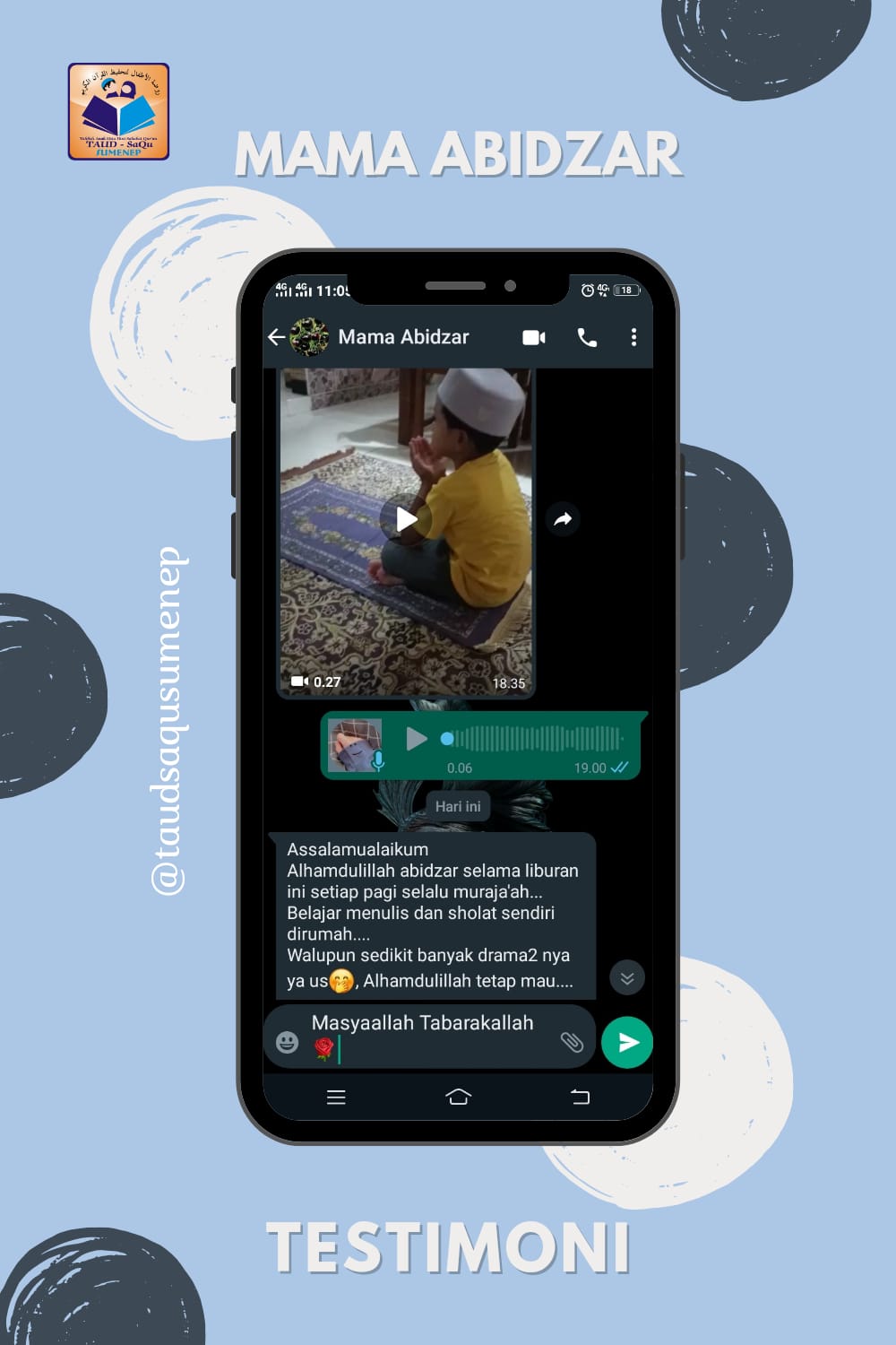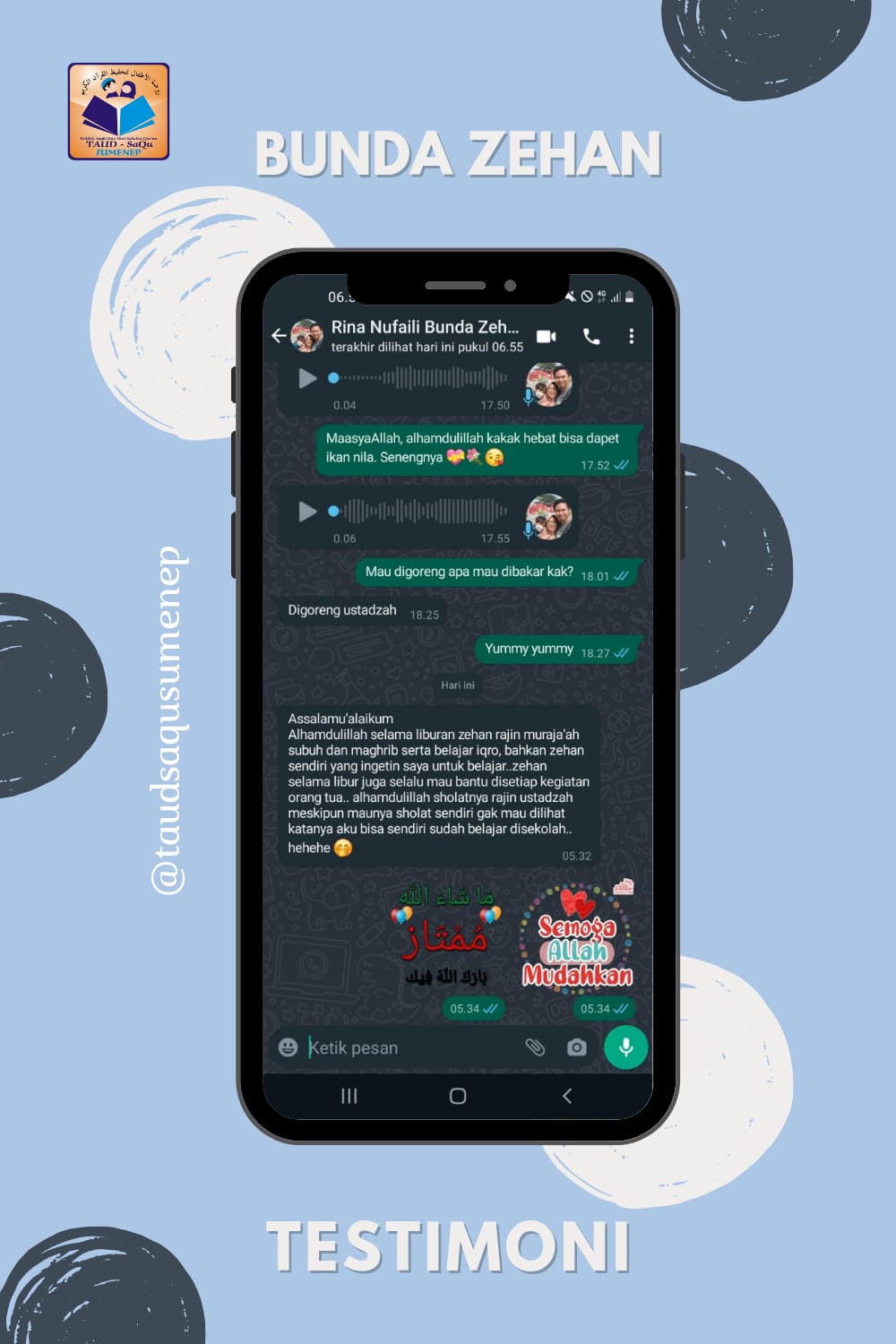Testimoni bunda Zehan“Salah satu metode yang baik untuk mengembalikan kejayaan islam ialah dengan melahirkan generasi baru yang lebih baik dari kita, yaitu generasi Qur’ani yang akan menjadi generasi yang senantiasa hidup dalam bimbingan wahyu.”