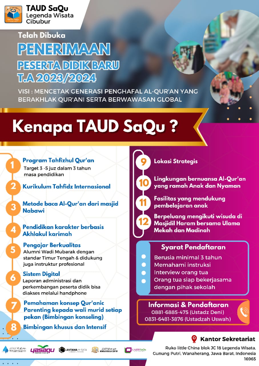 Tahfizh Anak Usia Dini Sahabt Qur’an merupakan sebuah Lembaga Pendidikan untuk jenjang usia 3 tahun sampai usia 7 tahun. Program utama menghafal Al-Qur’an (anak taud sedang membaca hafalannya). Dirintis sejak tahun 2013 hingga saat ini TAUD SAQU telah memiliki 170 cabang diseluruh Indonesia dengan berpusat di Megamendung-Bogor. Menjadi lembaga pendidikan Tahfizh anak usia dini yang mampu mencetak generasi penghafal Al-qur’an dan berakhlaq Al-qur’an.